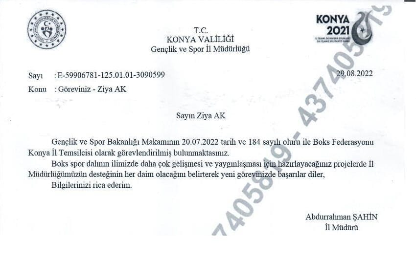 Türkiye Boks Federasyon Başkanı Eyüp GÖZGEÇ ’in imzasıyla yapılan resmi tebliğde; 3289 sayılı Gençlik ve Spor Hizmetleri kanununun ek maddesinin ilgili Fıkrası hükmü gereğince Türkiye Boks Federasyon Başkanlık makamının teklifi, Bakanlık Makamının onayı ile Konya il Temsilciliğine Ziya AK atanmıştır denildi.
